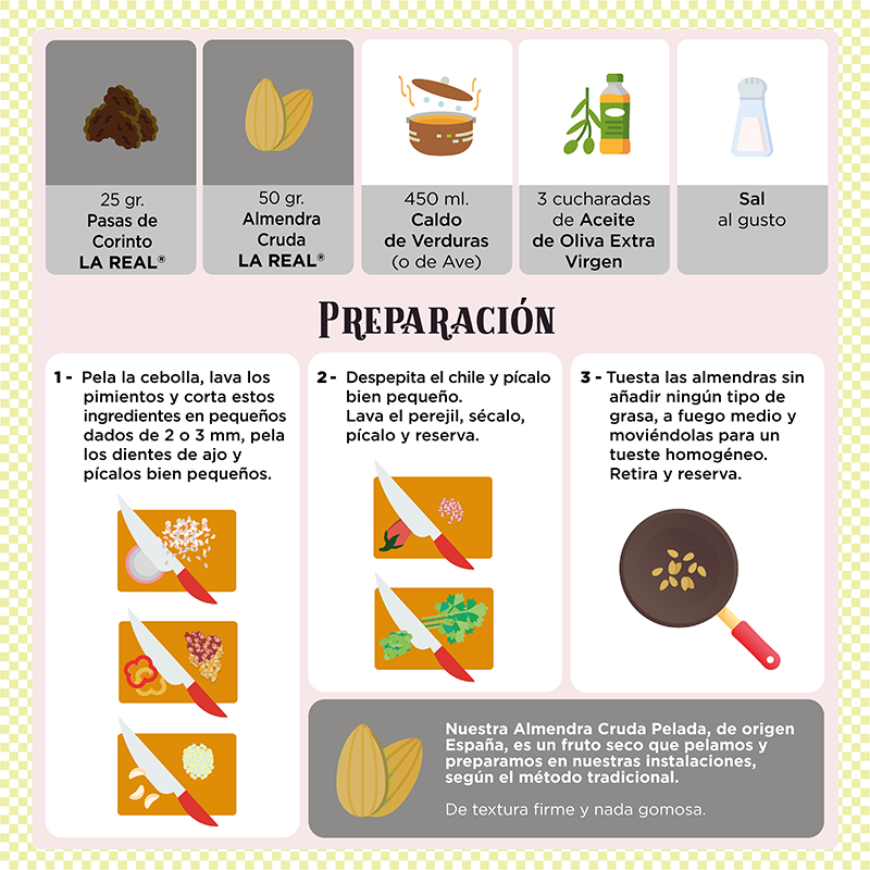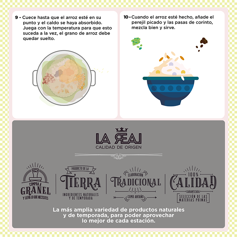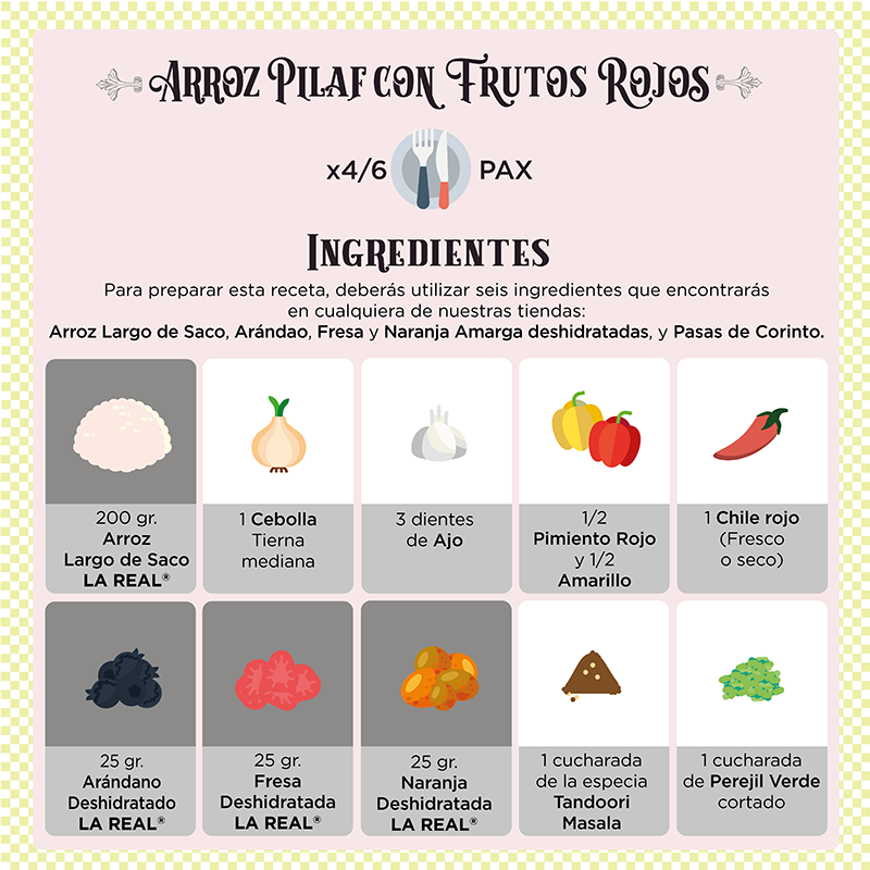 Para preparar esta receta, deberás utilizar seis ingredientes que encontrarás en cualquiera de nuestras tiendas: Arroz Largo de Saco, Arándano, Fresa y Naranja Amarga deshidratadas, y Pasas de Corinto.