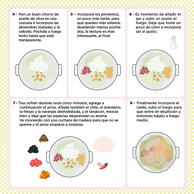 7 – Tras sofreir durante unos cinco minutos, agrega a continuación el arroz. Añade también el chile, el arándano, la fresas y la naranjas deshidratada, y el tandoori, mezcla bien y deja que las especias desprendan su aroma. Ve moviendo con una cuchara de madera para que no se queme y el arroz empiece a tostarse.