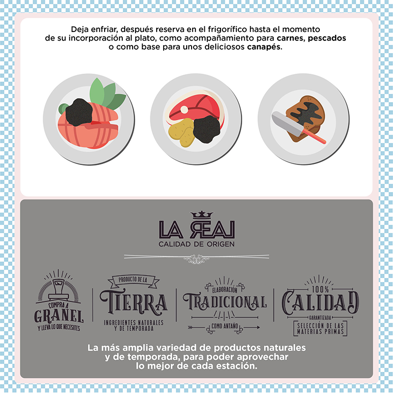Deja enfriar, después reserva en el frigorífico hasta el momento de su incorporación al plato, como acompañamiento para carnes, pescados o como base para unos deliciosos canapés.