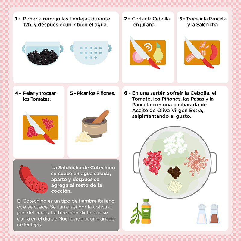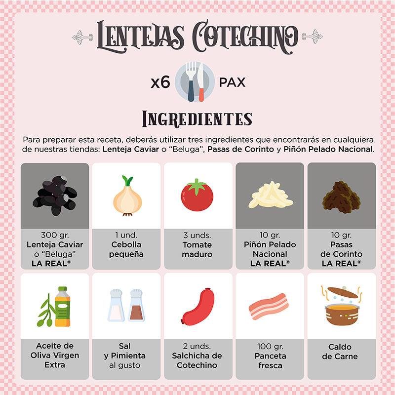 Para preparar esta receta, deberás utilizar tres ingredientes que encontrarás en cualquiera de nuestras tiendas: Lenteja Caviar o “Beluga”, Pasas de Corinto y Piñón Pelado Nacional.