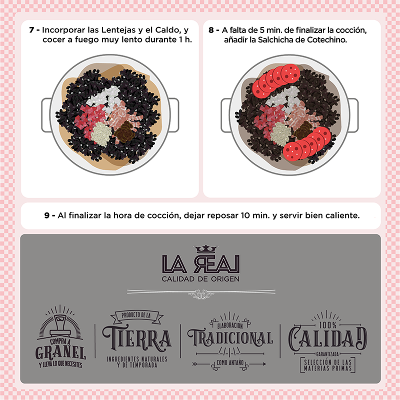 7 – Incorporar las Lentejas y el Caldo, y cocer a fuego muy lento durante 1 h.