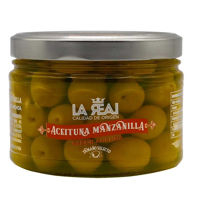 Los Aceituna Envasada sabor Anchoa son aceitunas de la variedad Manzanilla (entera), con un calibre entre 180/200, con un sabor extra a Anchoa. Se presenta en un envase de vidrio con un contenido escurrido de1 75 gr.