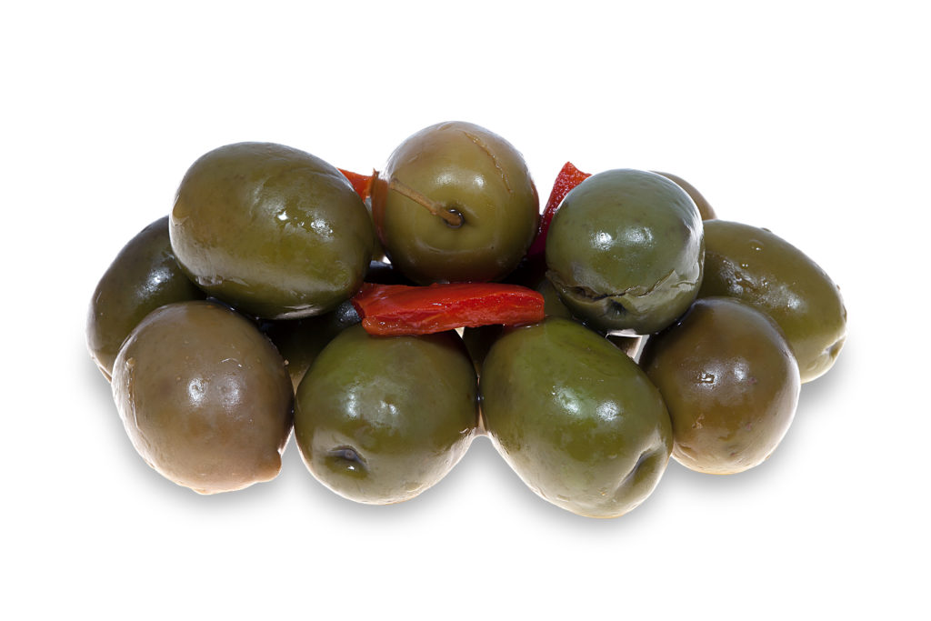 La Aceituna Machacabú en salmuera, son de color verde y están partidas partidas, aliñadas con guindilla troceada, pimiento rojo troceado, ajos y sal.