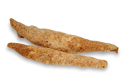 Los snacks salados de Corteza de Jamón, fritos en aceite y salados, se presentan en crujientes tiras enteras de jamón curado.