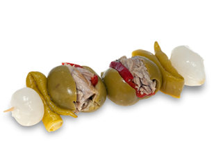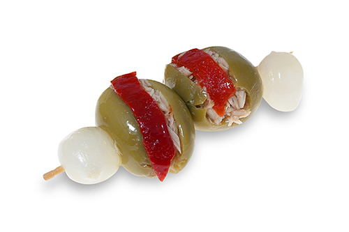 El Pincho Doble de Bonito, elaboradas de forma tradicional, están compuestos por: Aceituna Gordal deshuesada, pimiento del piquillo, bonito en escabeche, cebollita y aceite de oliva. Sorprende a tus invitados con las creaciones exclusivas de La Real.