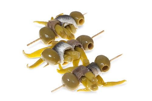 El Pincho Matrimonio, elaborados de forma tradicional, están compuestos por: Aceituna manzanilla deshuesada, piparra, filete de boquerón y aceite de oliva. Sorprende a tus invitados con las creaciones exclusivas de La Real.