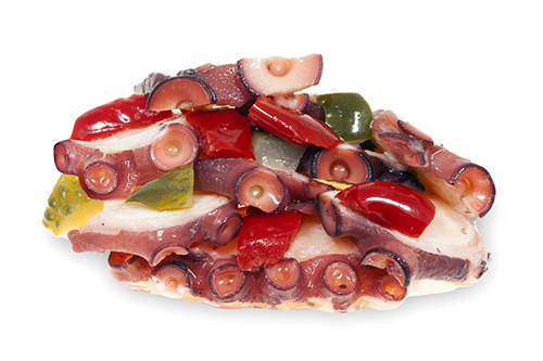 El Pulpo a la Vinagreta, está elaborado según el método tradicional. Contiene: Pulpo cocido, cebolla, pimiento, pepinillo, aceite de girasol, aceite de oliva, vinagre y sal.